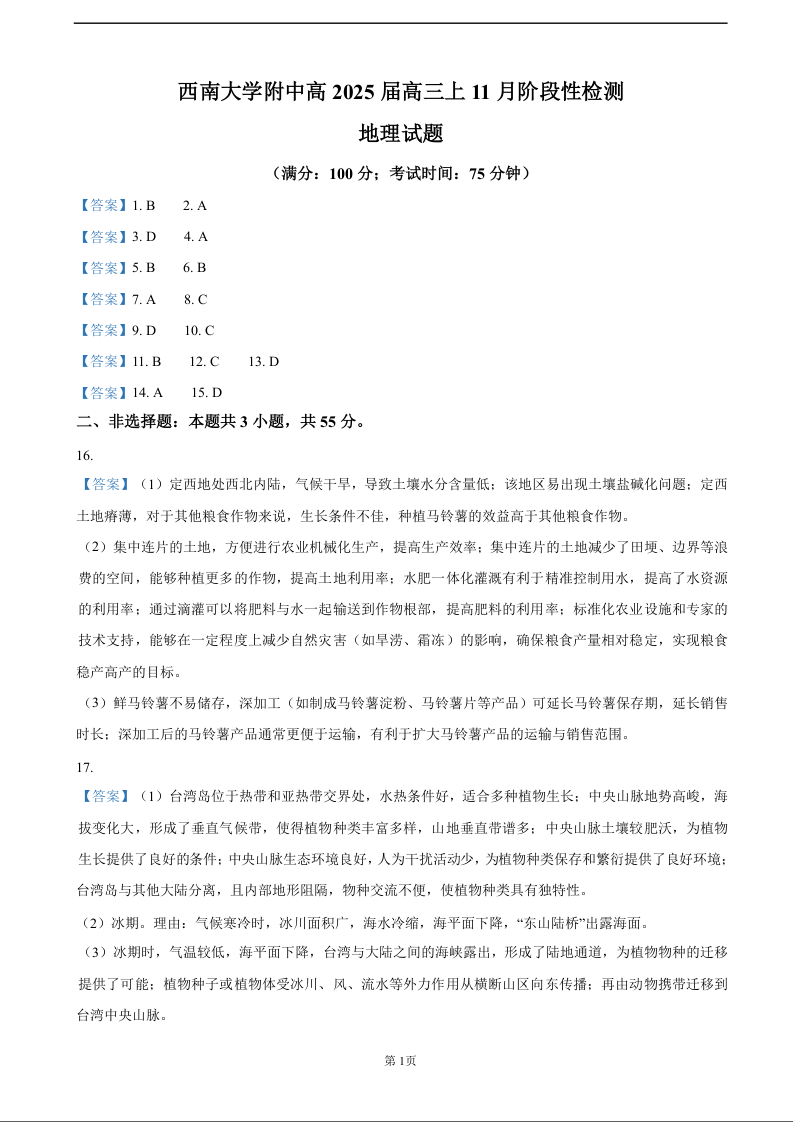 重庆市西南大学附中高2025届高三上11月阶段性检测 地理答案