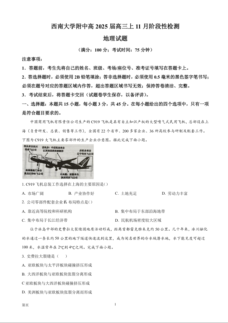 重庆市西南大学附中高2025届高三上11月阶段性检测 地理