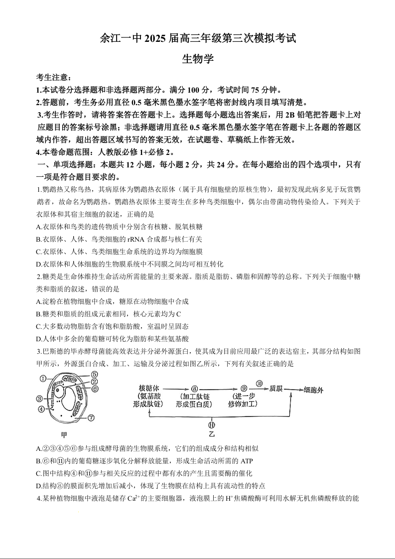 江西省鹰潭市余江区第一中学2025届高三上学期11月期中考试 生物