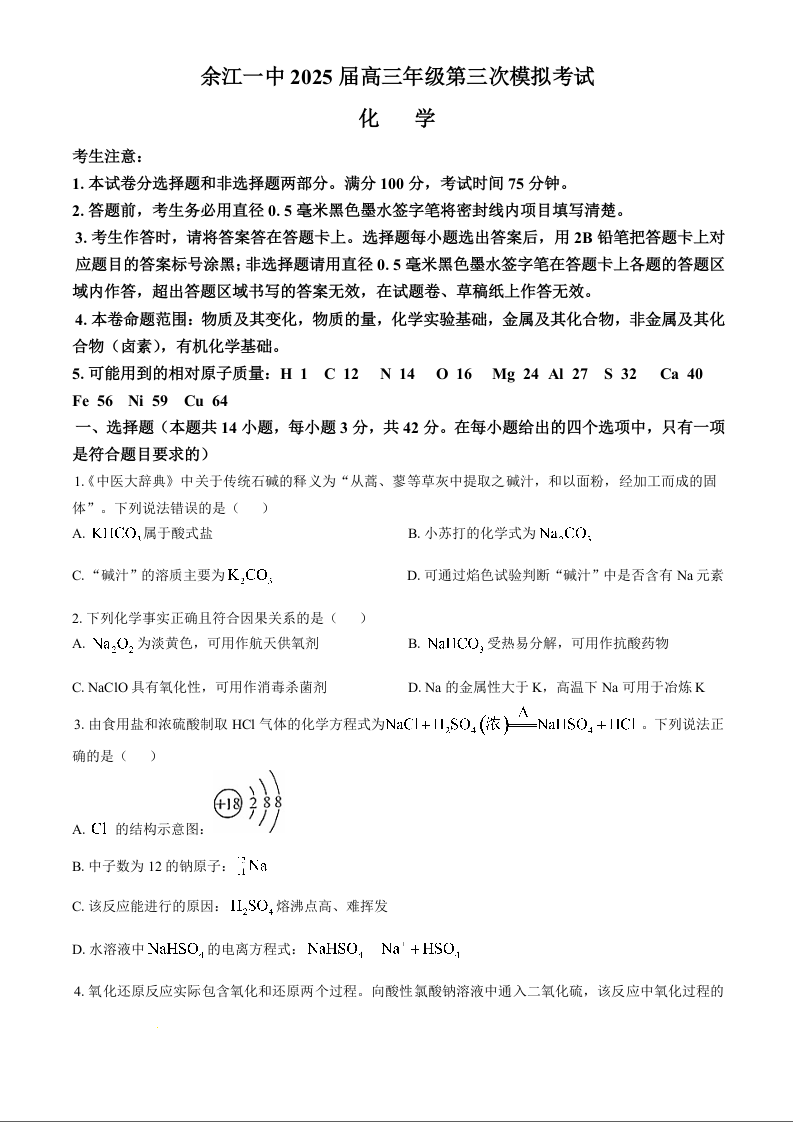 江西省鹰潭市余江区第一中学2025届高三上学期11月期中考试 化学