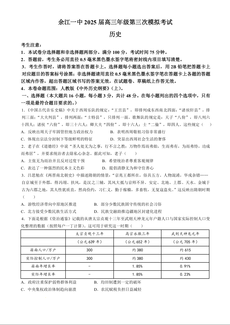 江西省鹰潭市余江区第一中学2025届高三上学期11月期中考试 历史