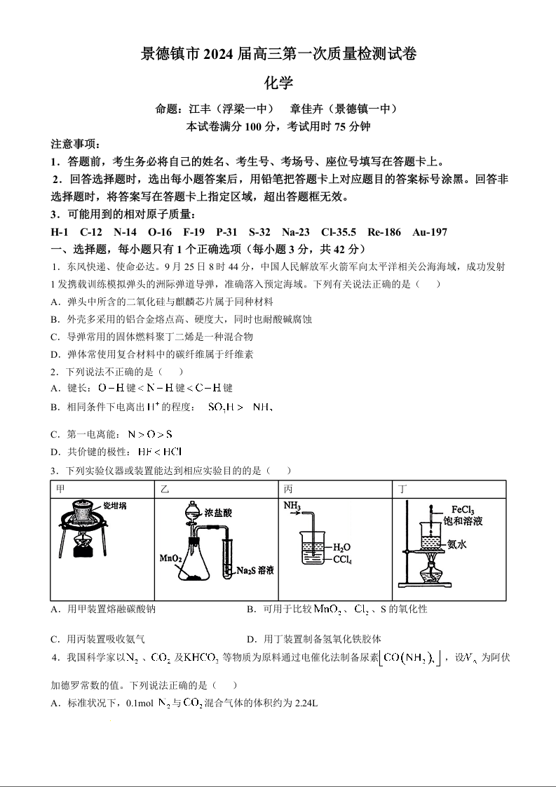 江西省景德镇市2025届高三第一次质量检测 化学