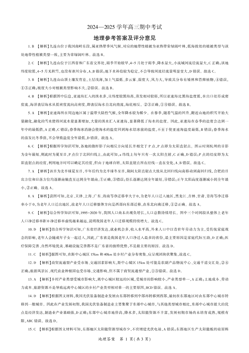 山东省百师联考2024-2025学年高三年级上学期期中质量检测 地理答案