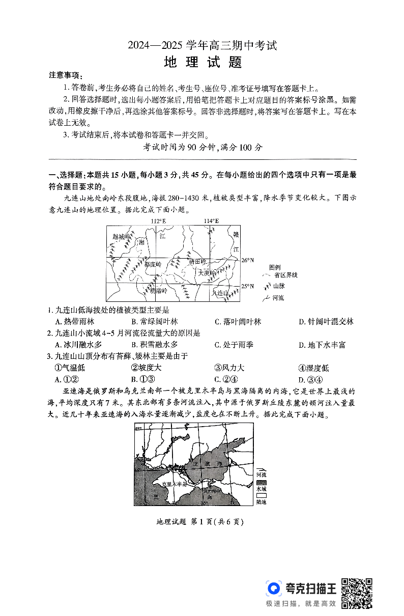 山东省百师联考2024-2025学年高三年级上学期期中质量检测 地理