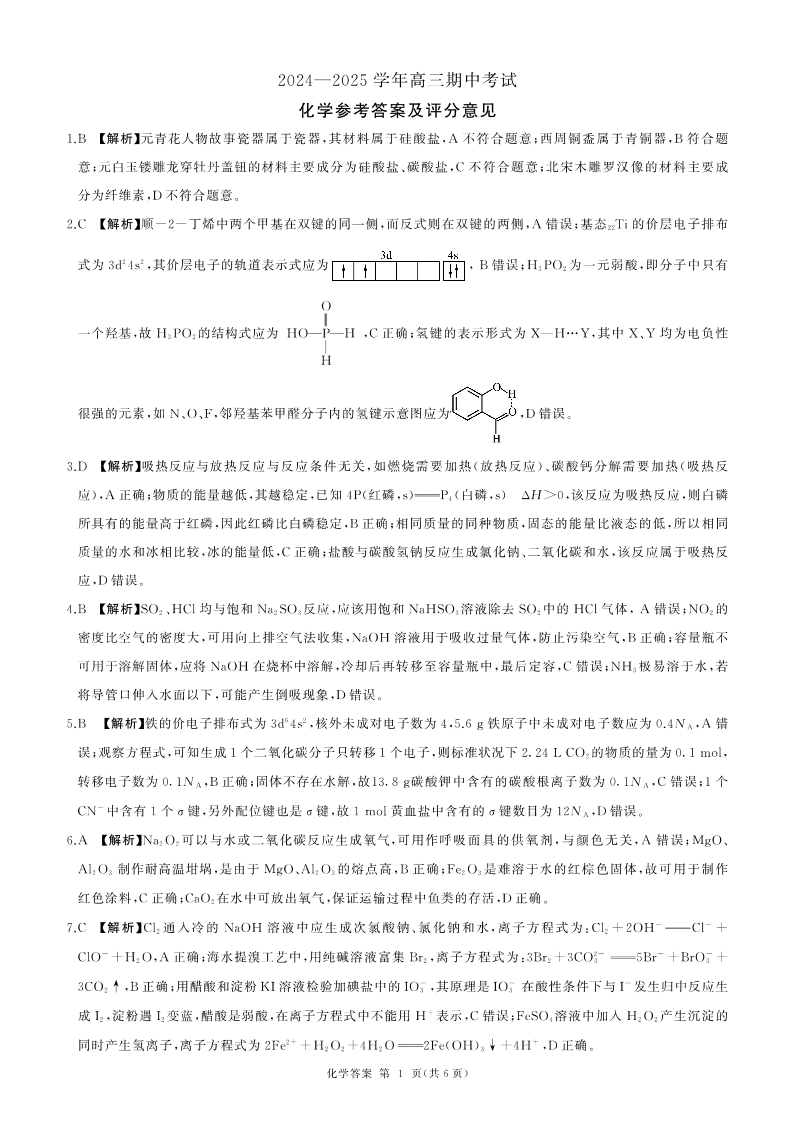 山东省百师联考2024-2025学年高三年级上学期期中质量检测 化学答案