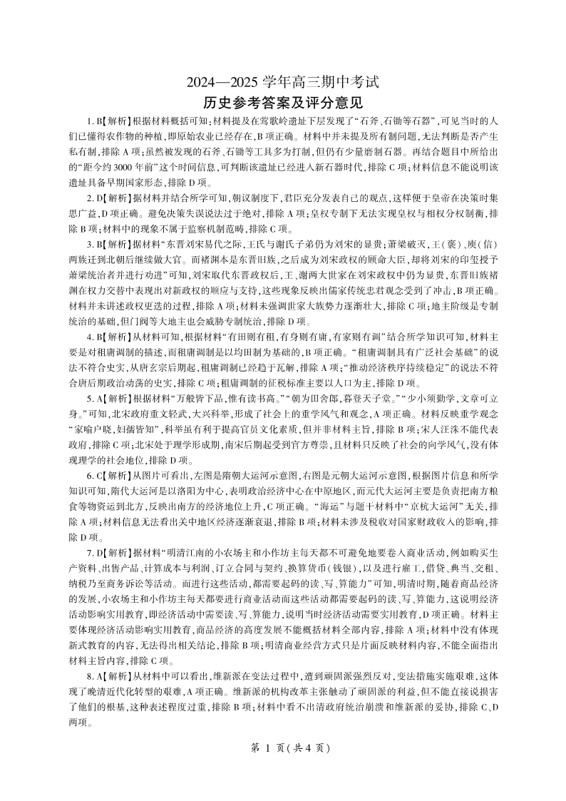 山东省百师联考2024-2025学年高三年级上学期期中质量检测 历史答案