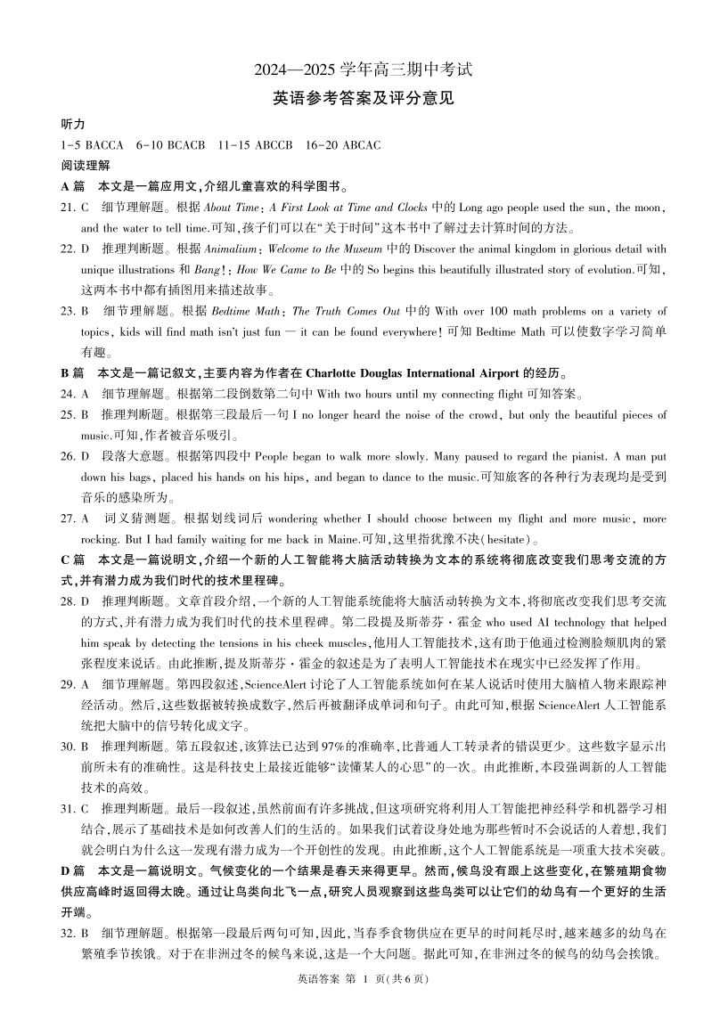 山东省百师联考2024-2025学年高三年级上学期期中质量检测 英语答案