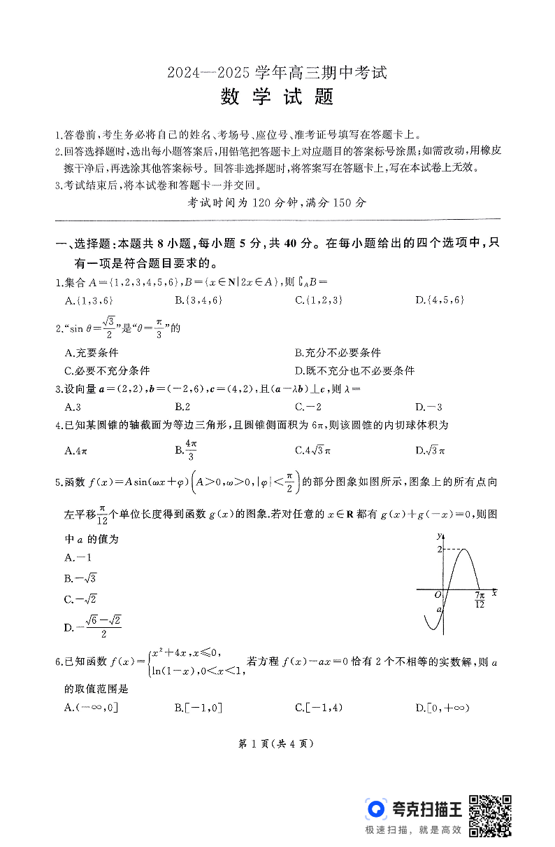 山东省百师联考2024-2025学年高三年级上学期期中质量检测 数学