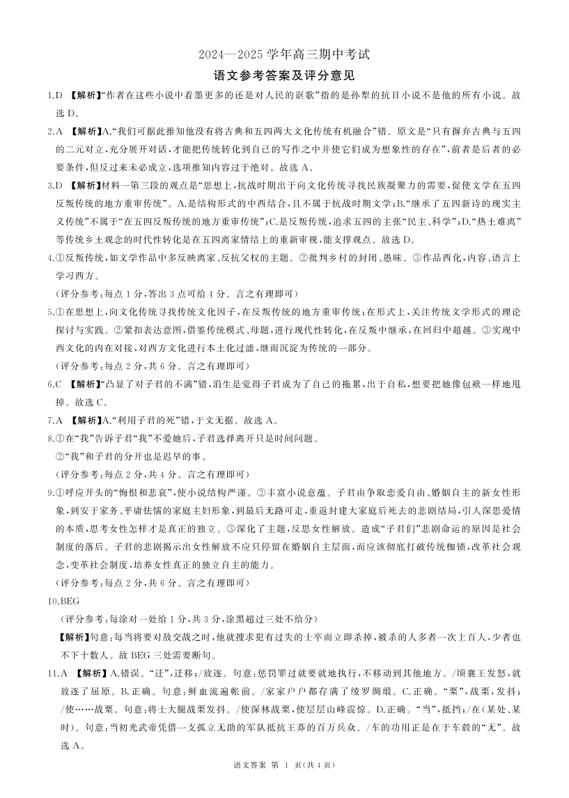 山东省百师联考2024-2025学年高三年级上学期期中质量检测 语文答案