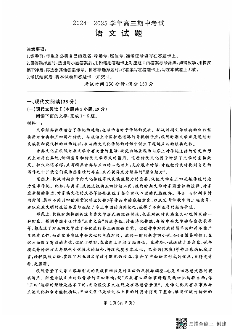 山东省百师联考2024-2025学年高三年级上学期期中质量检测 语文
