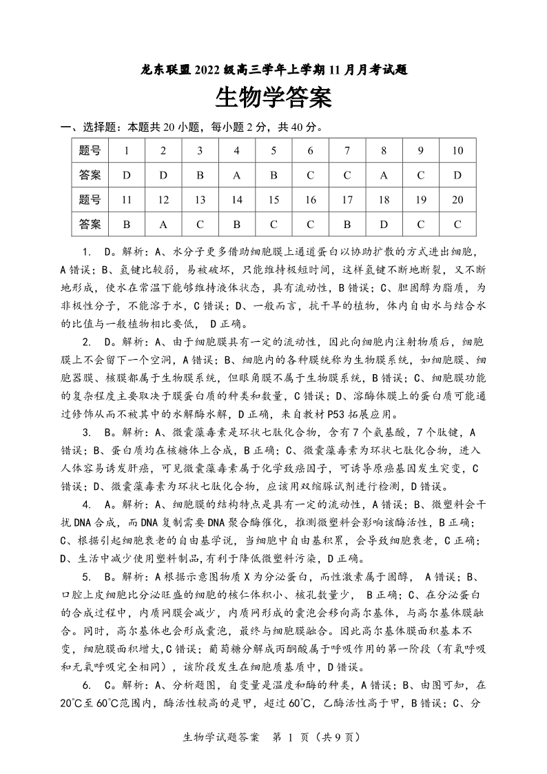 黑龙江省龙东联盟2024-2025学年高三上学期11月月考 生物答案