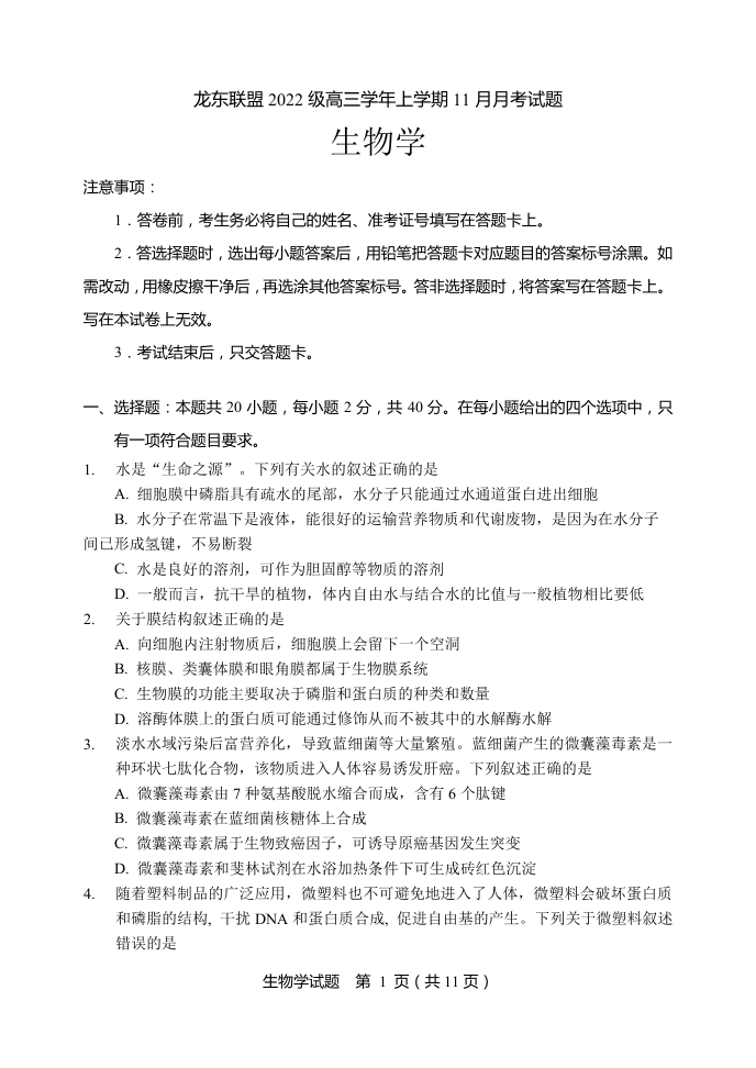 黑龙江省龙东联盟2024-2025学年高三上学期11月月考 生物
