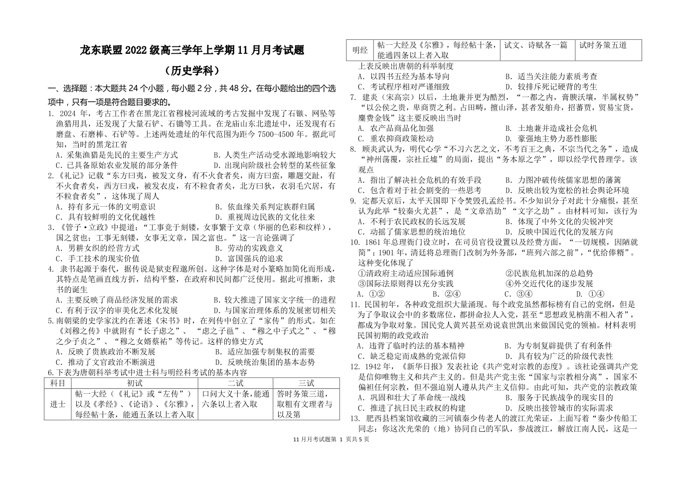 黑龙江省龙东联盟2024-2025学年高三上学期11月月考 历史