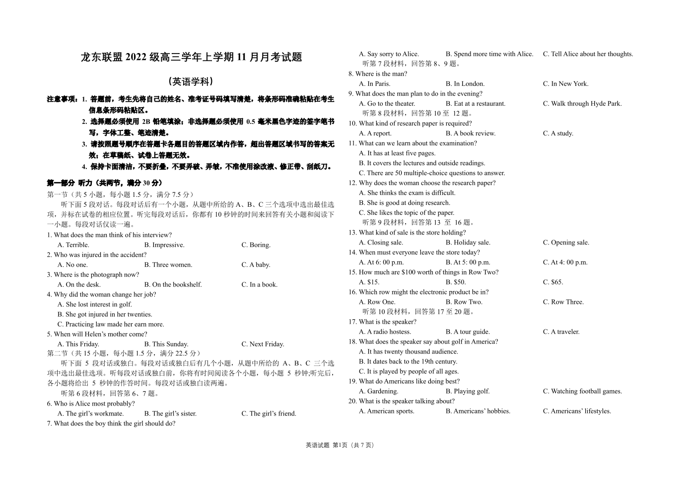 黑龙江省龙东联盟2024-2025学年高三上学期11月月考 英语