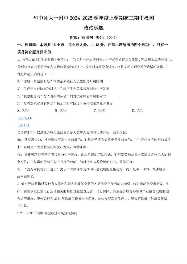 湖北省华中师大一附中2024-2025学年度上学期高三期中检测 政治答案