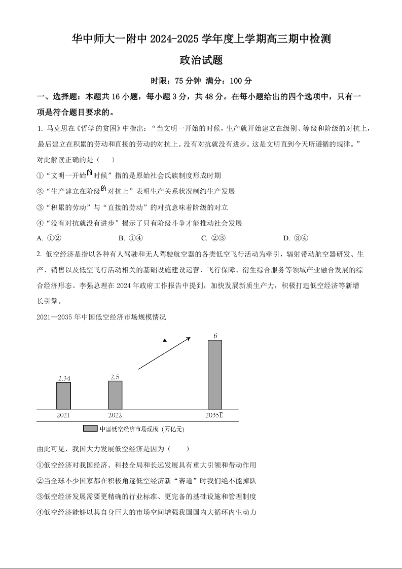 湖北省华中师大一附中2024-2025学年度上学期高三期中检测 政治