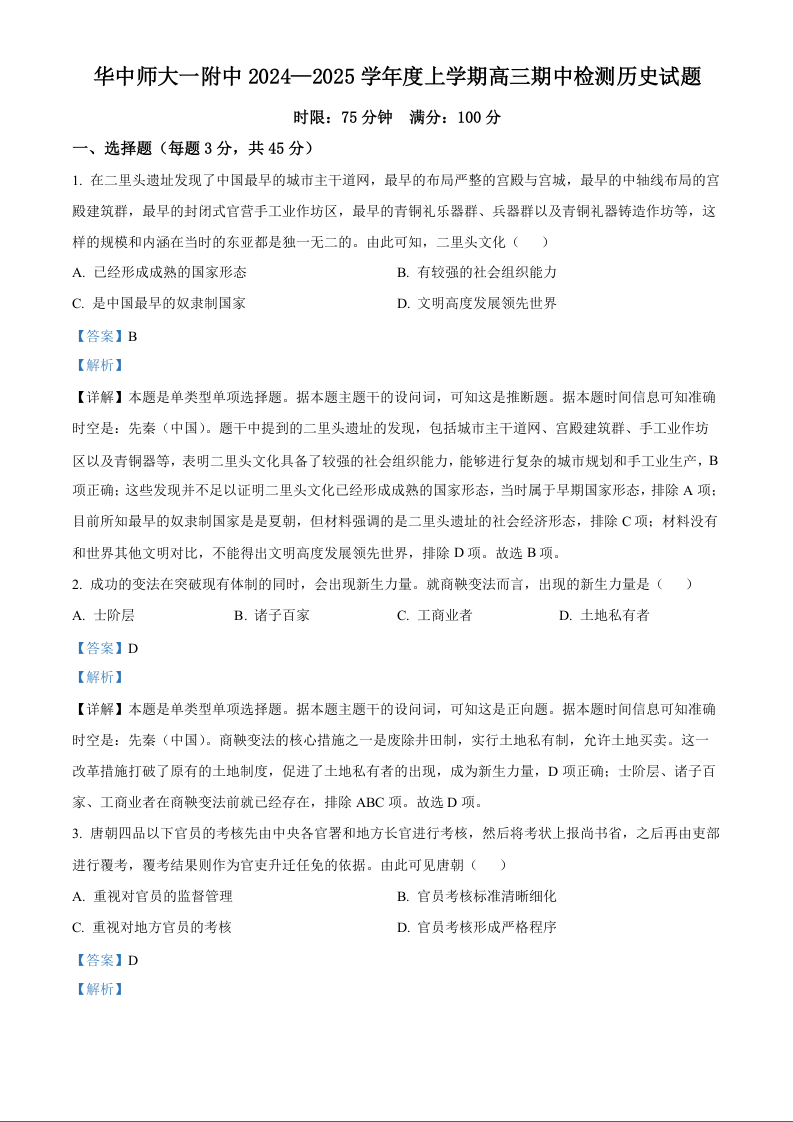 湖北省华中师大一附中2024-2025学年度上学期高三期中检测 历史答案