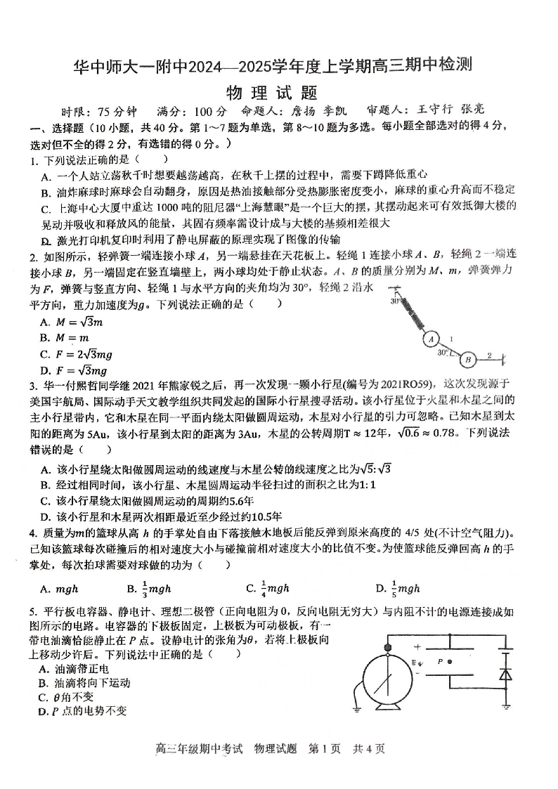 湖北省华中师大一附中2024-2025学年度上学期高三期中检测 物理