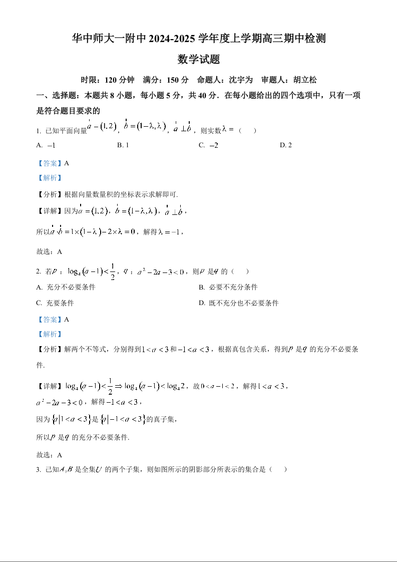 湖北省华中师大一附中2024-2025学年度上学期高三期中检测 数学答案