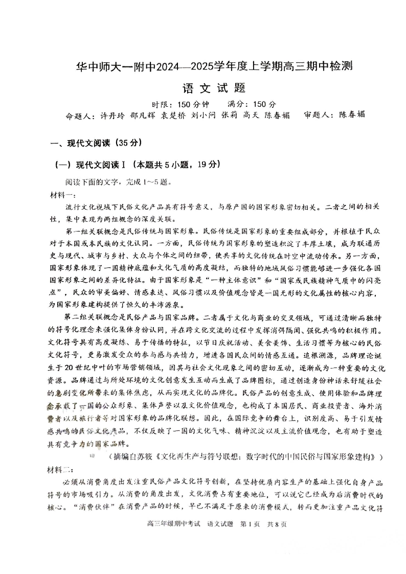 湖北省华中师大一附中2024-2025学年度上学期高三期中检测 语文