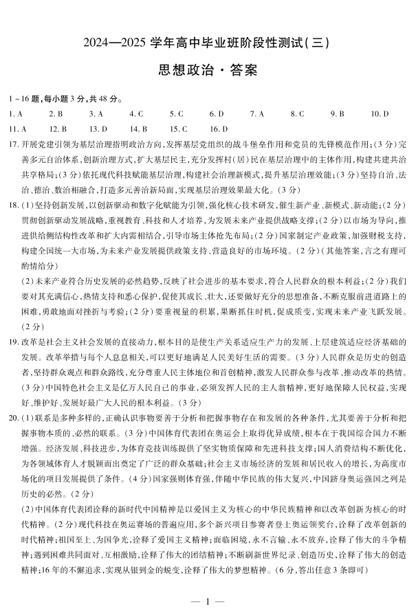 2025届河南天一大联考高三阶段性检测(三)政治答案