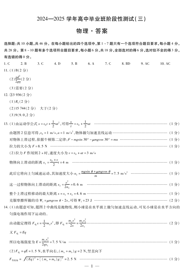 2025届河南天一大联考高三阶段性检测(三)物理答案