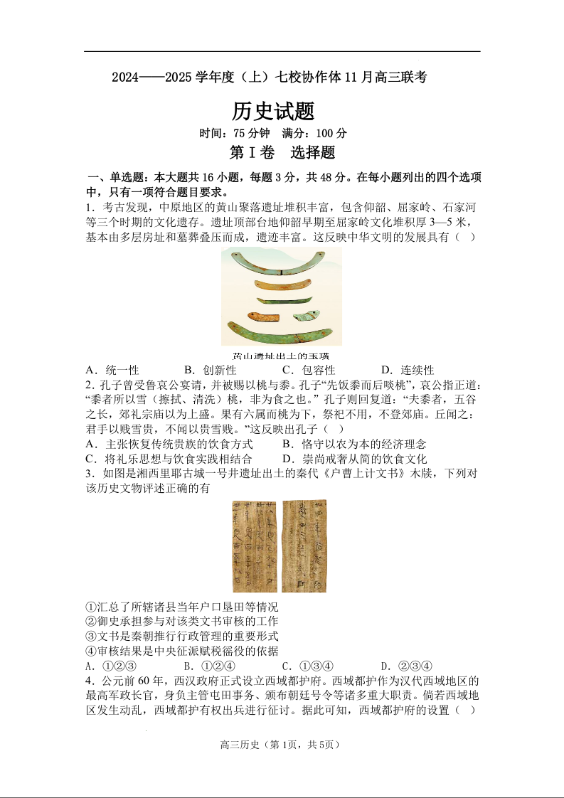 辽宁省七校协作体2025届高三上学期11月期中考试 历史