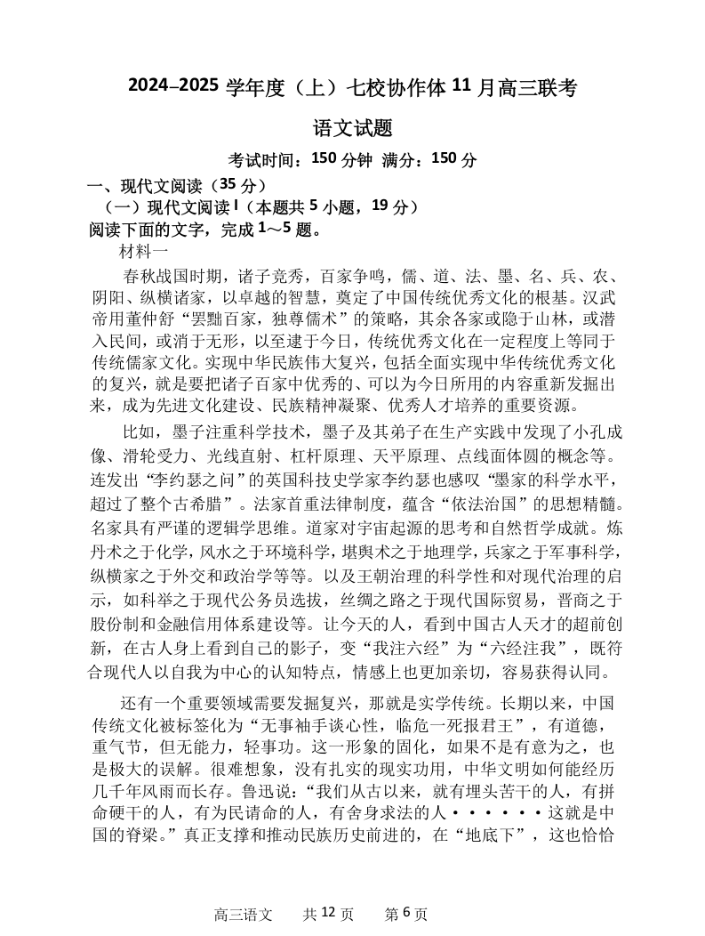 辽宁省七校协作体2025届高三上学期11月期中考试 语文