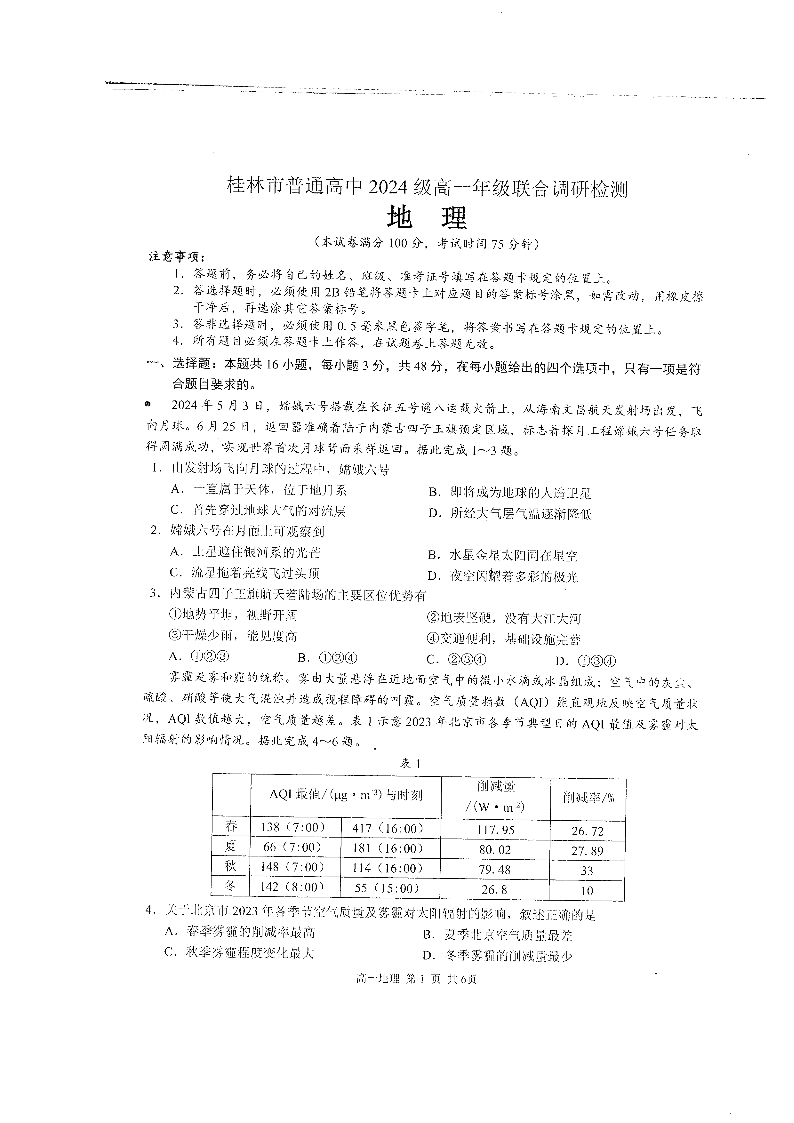 桂林2024年秋季期中联考高一 地理