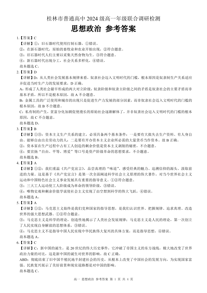 桂林2024年秋季期中联考高一 政治答案