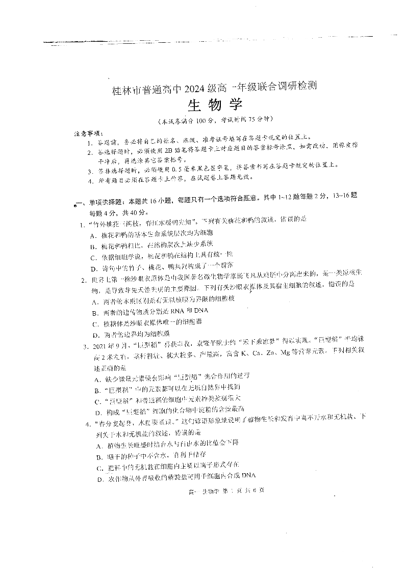 桂林2024年秋季期中联考高一 生物