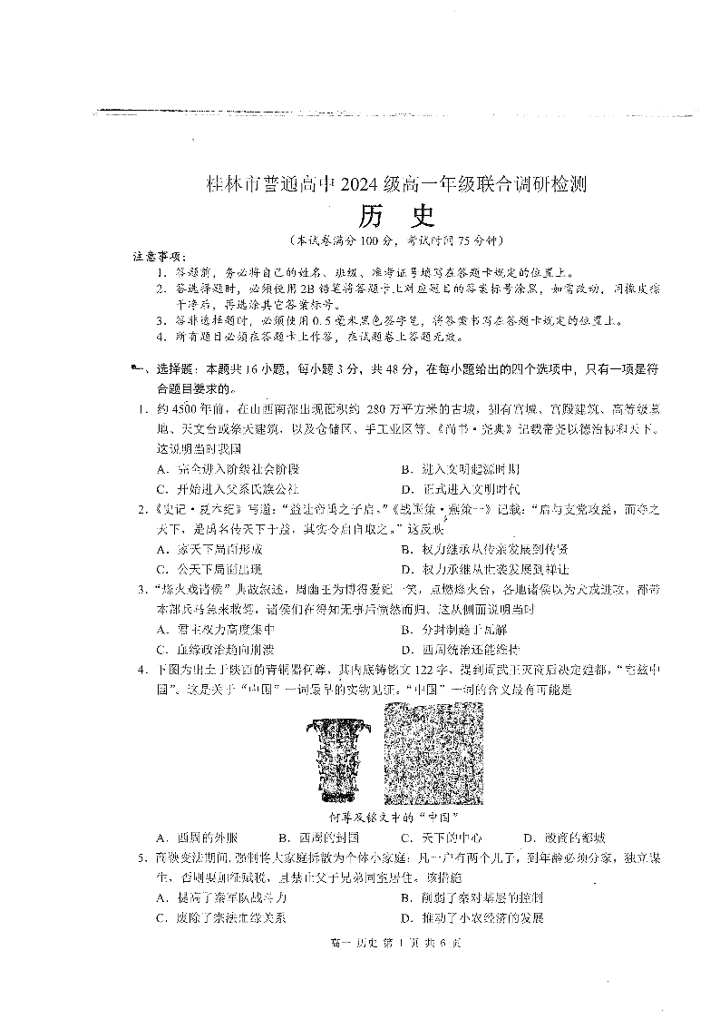 桂林2024年秋季期中联考高一 历史
