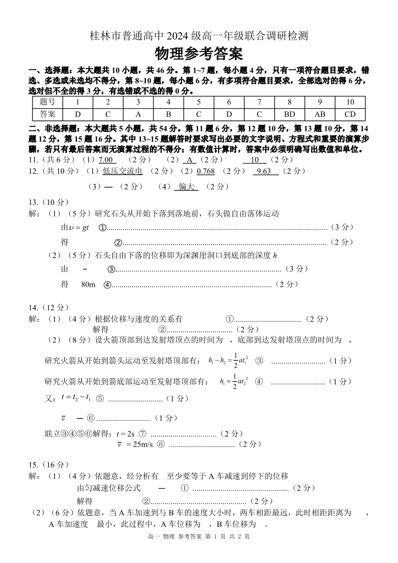 桂林2024年秋季期中联考高一 物理答案