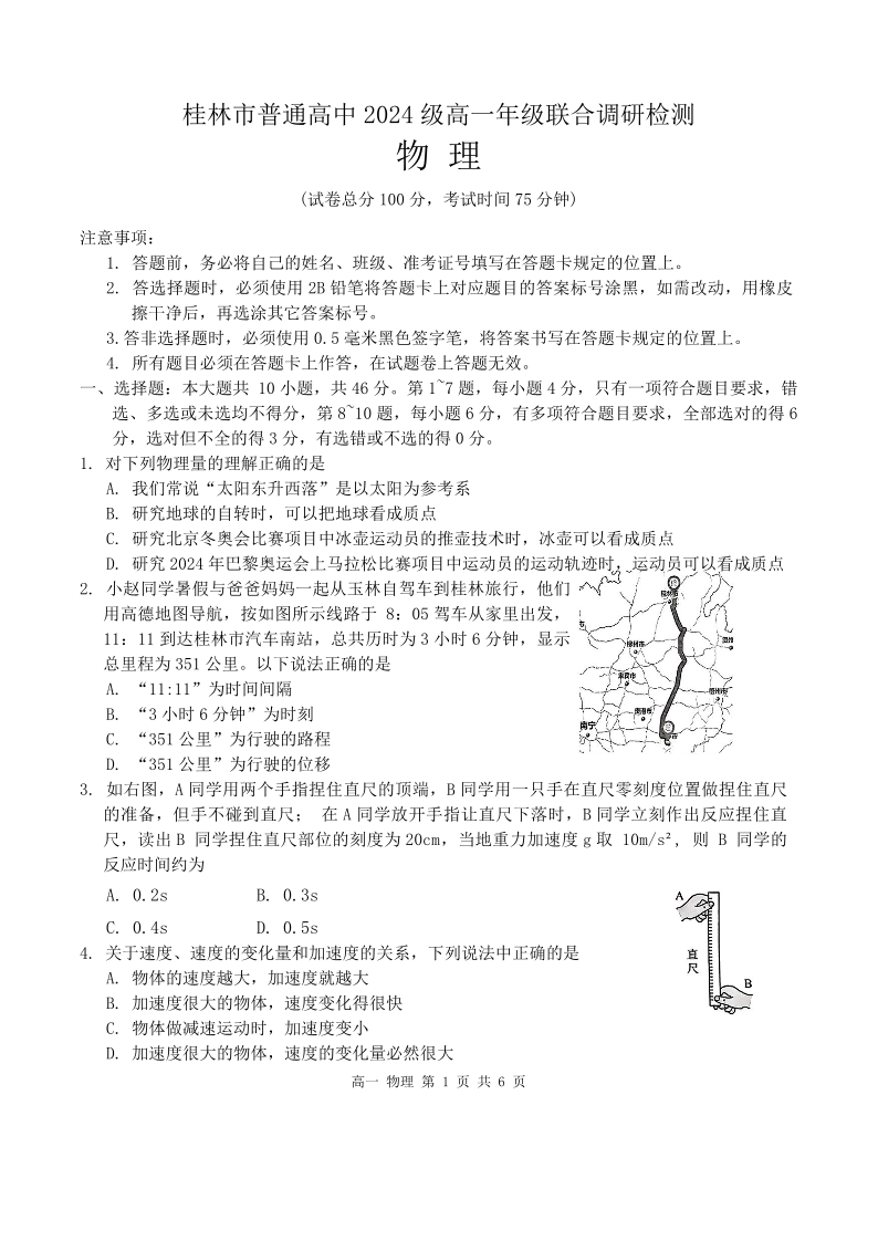 桂林2024年秋季期中联考高一 物理