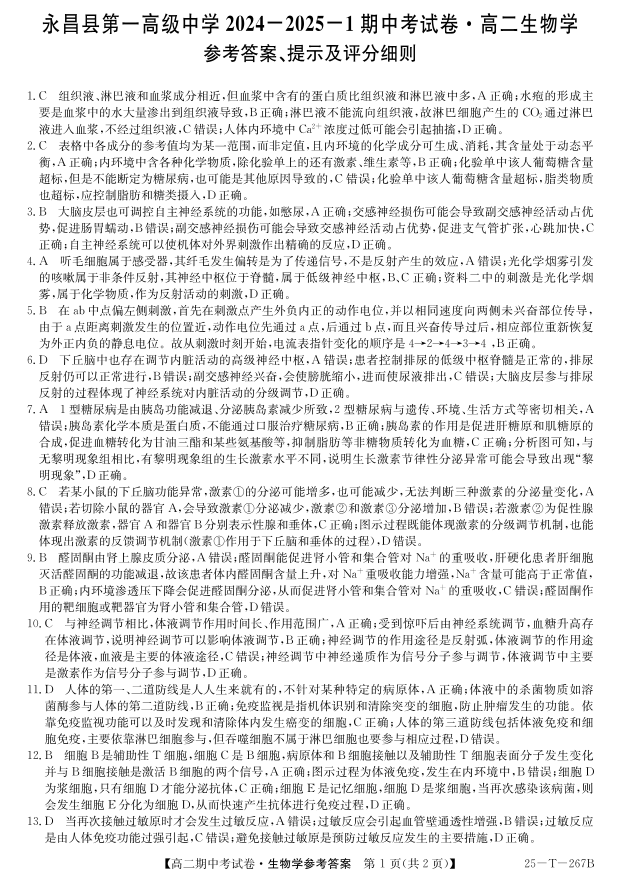甘肃省永昌县第一高级中学2024-2025学年高二上学期期中考试 生物答案