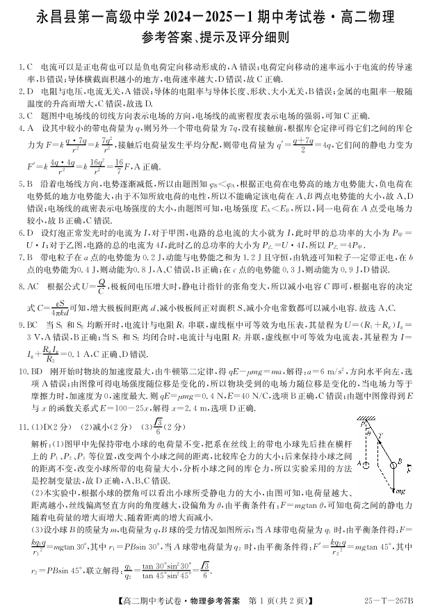 甘肃省永昌县第一高级中学2024-2025学年高二上学期期中考试 物理答案