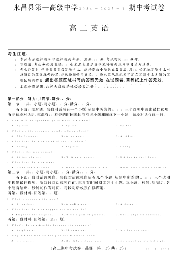 甘肃省永昌县第一高级中学2024-2025学年高二上学期期中考试 英语