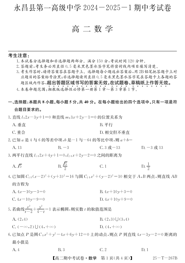 甘肃省永昌县第一高级中学2024-2025学年高二上学期期中考试 数学