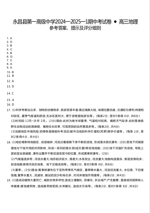 甘肃省永昌县第一高级中学2024-2025学年高三上学期期中考试 地理答案