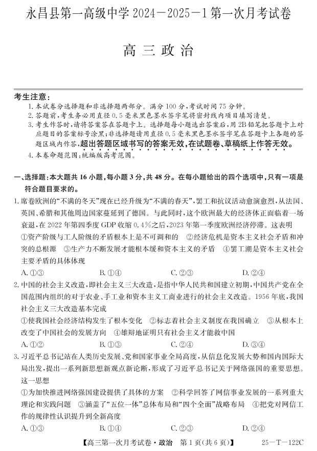 甘肃省永昌县第一高级中学2024-2025学年高三上学期期中考试 政治