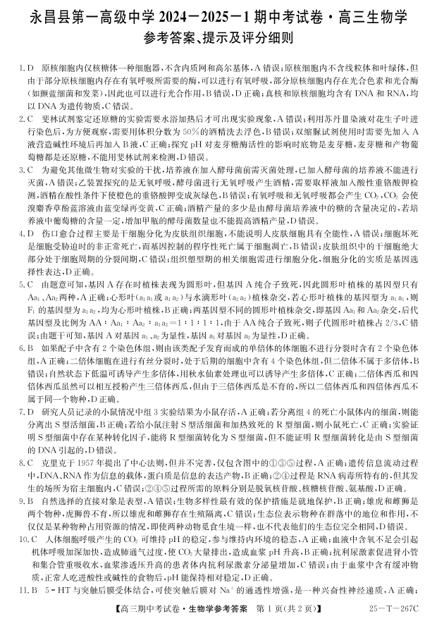 甘肃省永昌县第一高级中学2024-2025学年高三上学期期中考试 生物答案