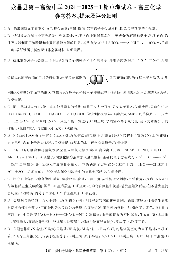 甘肃省永昌县第一高级中学2024-2025学年高三上学期期中考试 化学答案