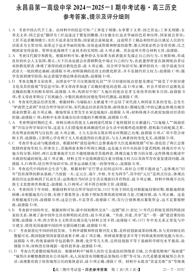 甘肃省永昌县第一高级中学2024-2025学年高三上学期期中考试 历史答案