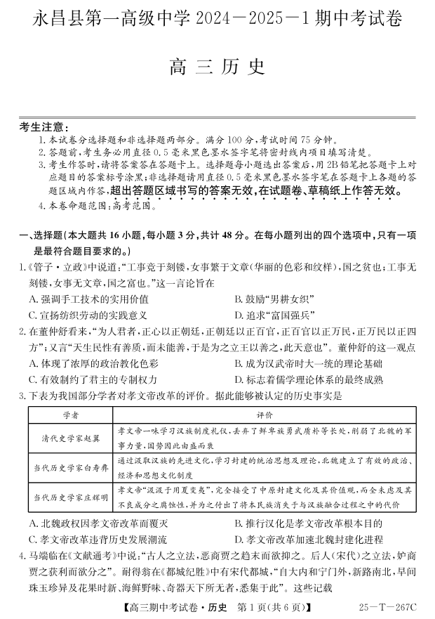 甘肃省永昌县第一高级中学2024-2025学年高三上学期期中考试 历史