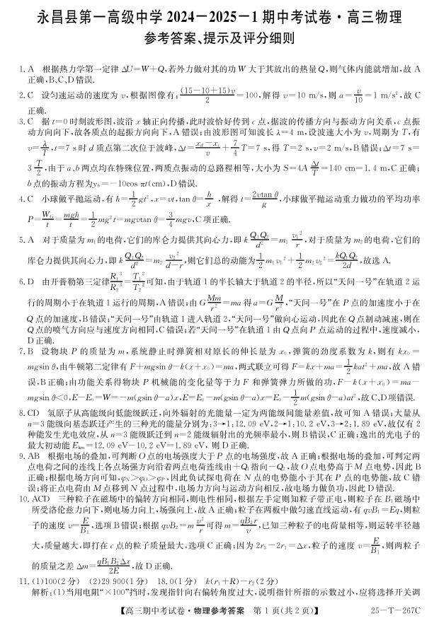 甘肃省永昌县第一高级中学2024-2025学年高三上学期期中考试 物理答案