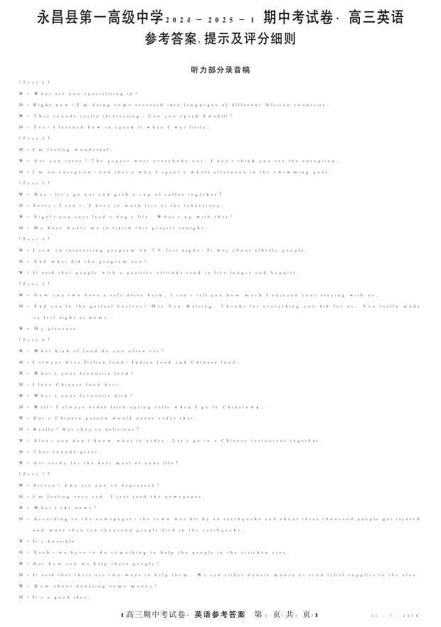 甘肃省永昌县第一高级中学2024-2025学年高三上学期期中考试 英语答案