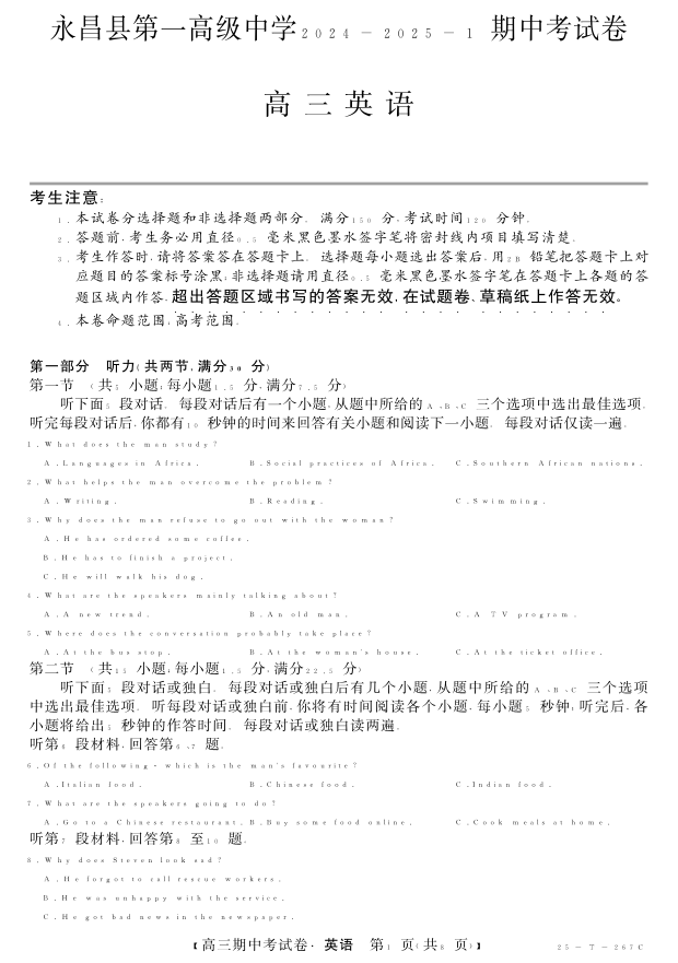 甘肃省永昌县第一高级中学2024-2025学年高三上学期期中考试 英语