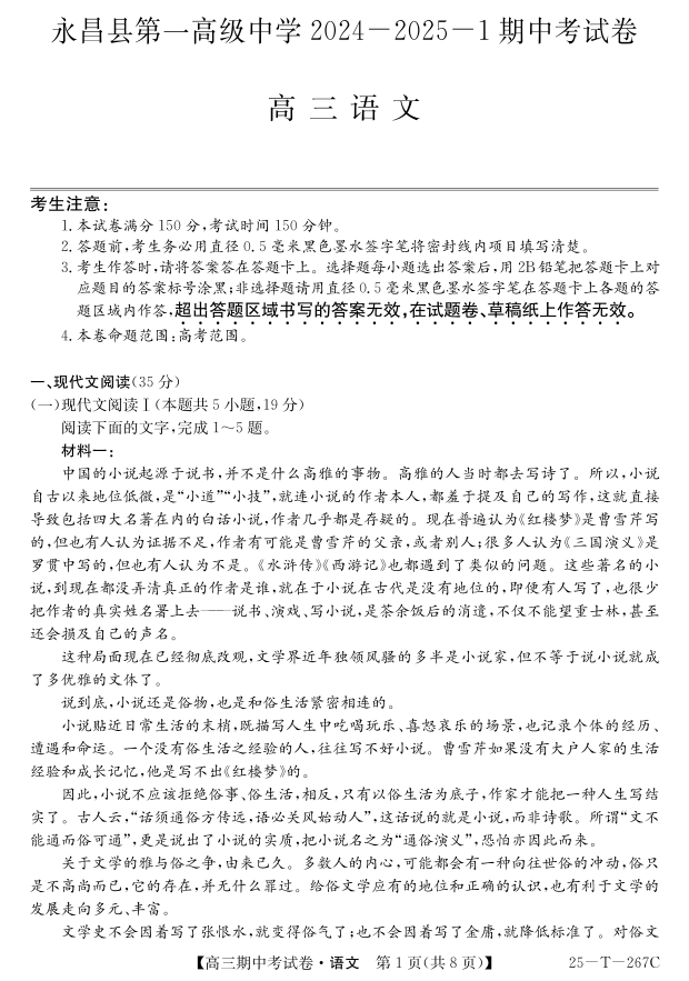 甘肃省永昌县第一高级中学2024-2025学年高三上学期期中考试 语文