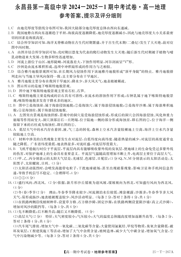 甘肃省永昌县第一高级中学2024-2025学年高一上学期期中考试 地理答案