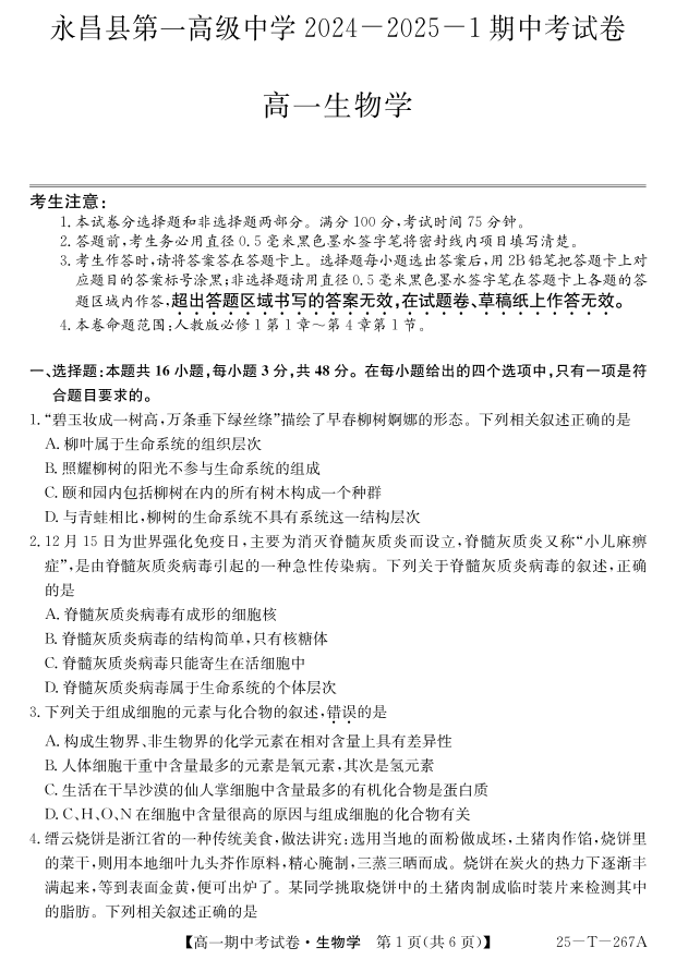 甘肃省永昌县第一高级中学2024-2025学年高一上学期期中考试 生物
